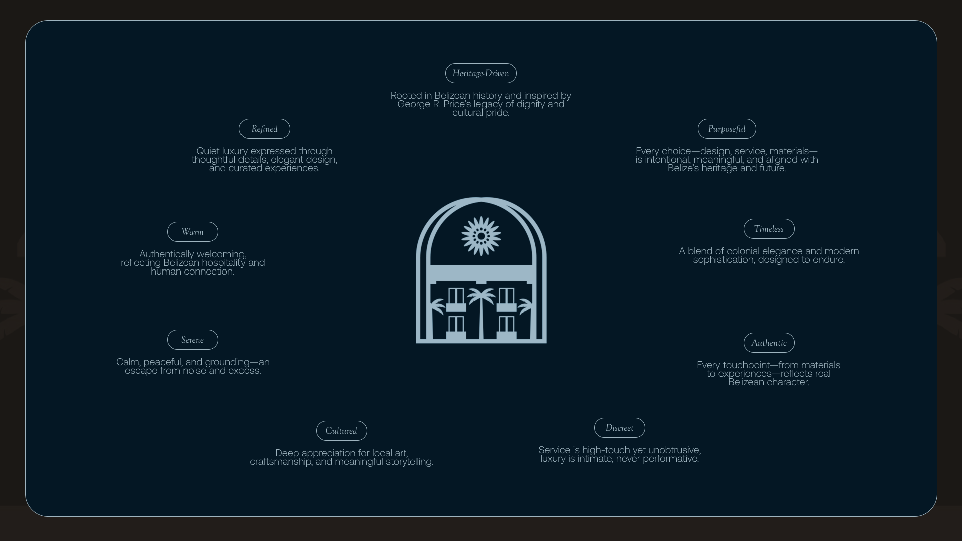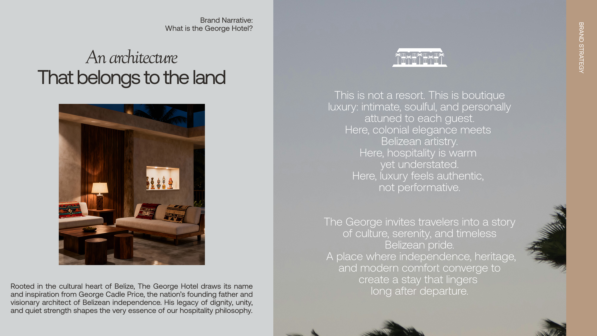 For The George Hotel, part of The Belize Collection, the brand direction balances refined luxury with deep cultural provenance. Named after George Price, a pivotal figure in Belize’s journey to independence, the identity honors national pride while elevating the hotel’s contemporary, high-end positioning. The design language blends sophistication with a strong sense of place, drawing from Belize’s heritage, textures, and natural tones to create a visual system that feels both exclusive and deeply rooted in the land it belongs to.